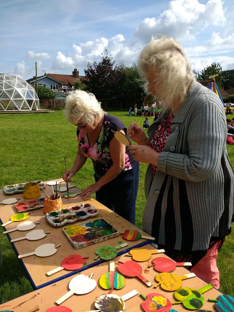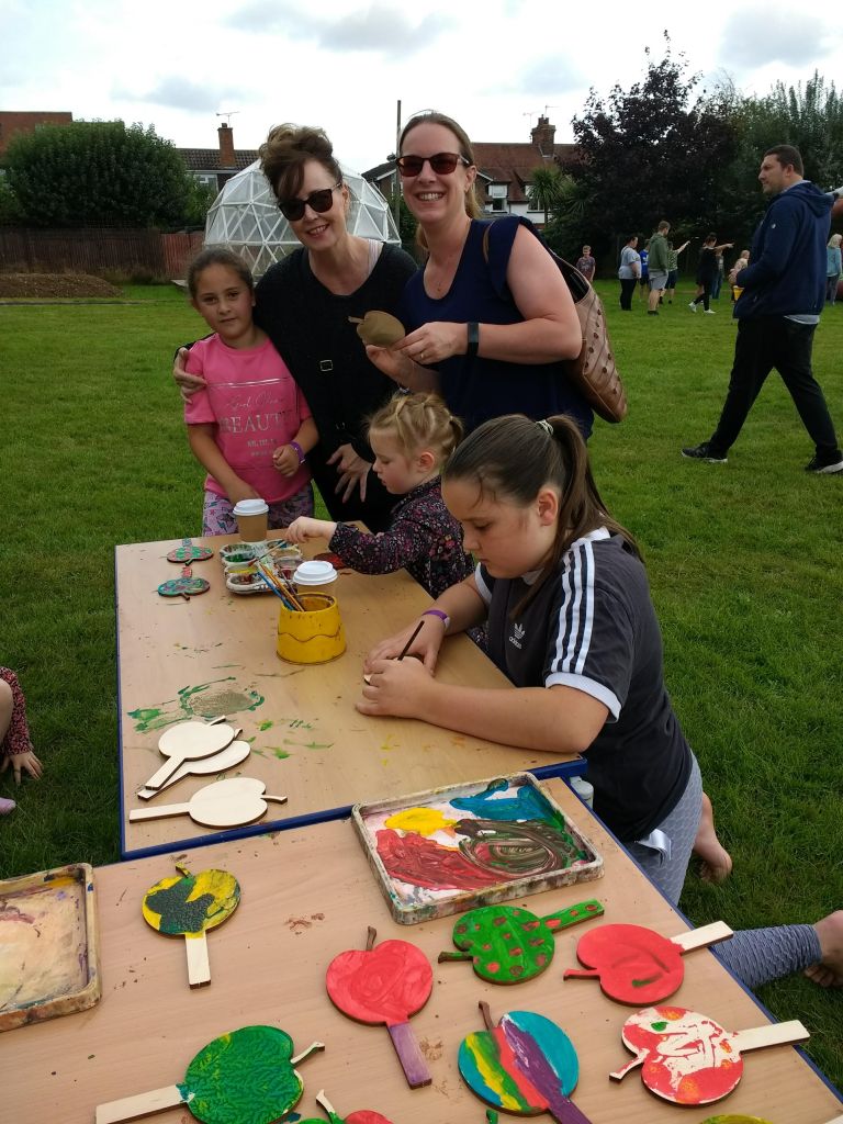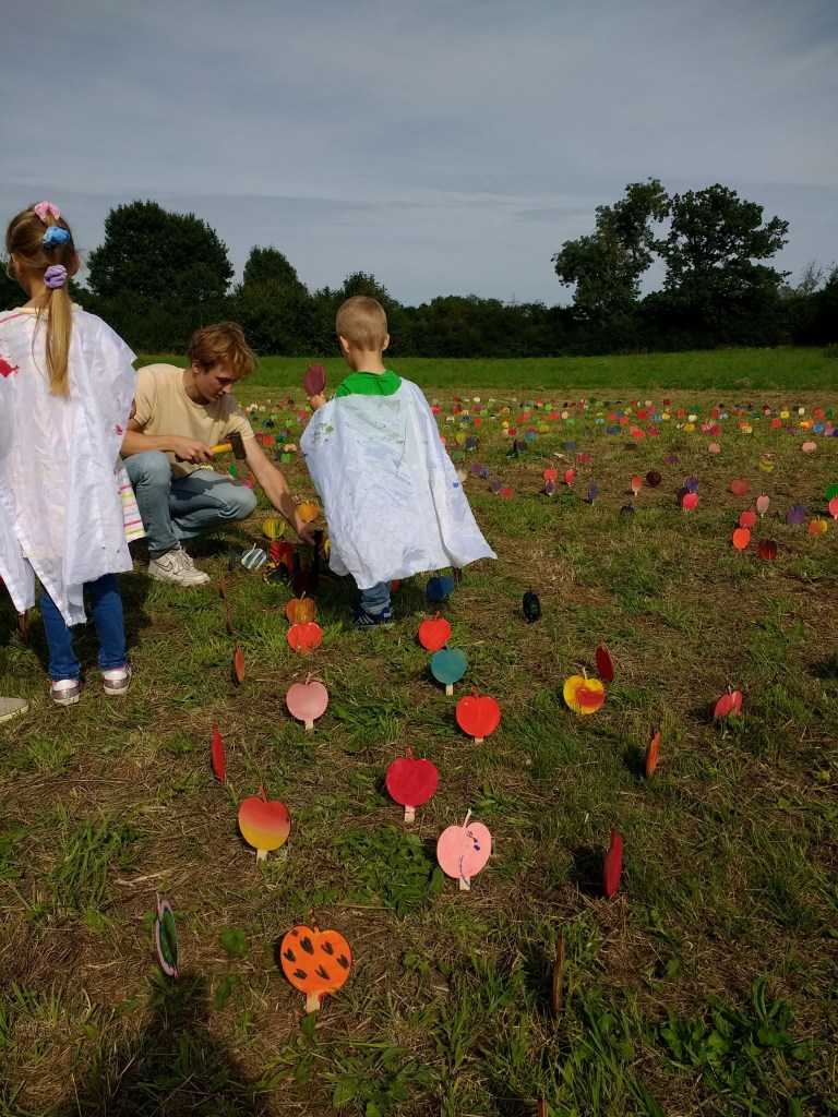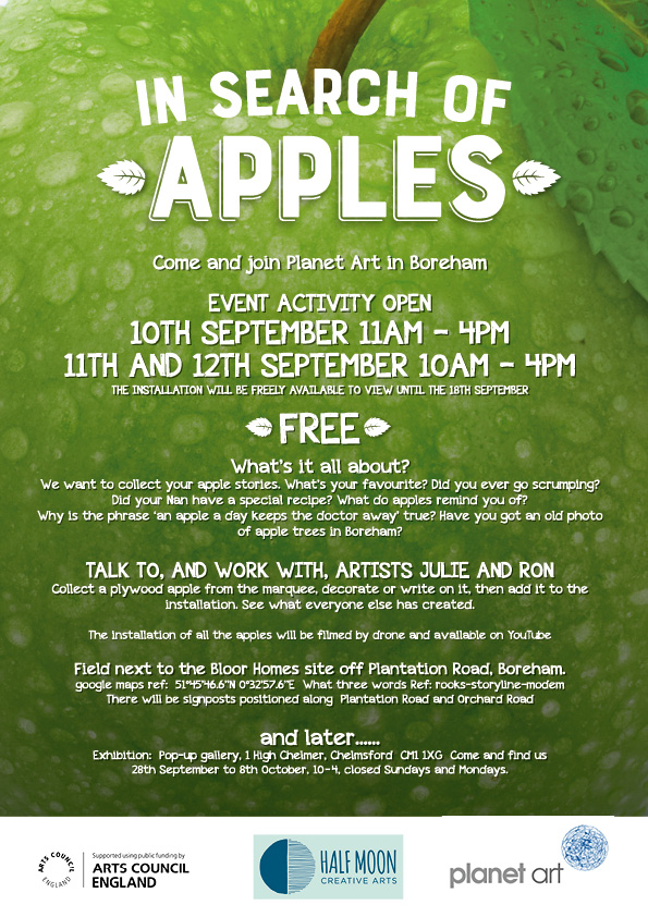 One sunny day, in a field, in Boreham, there appeared a tent and two artists, and their son who came to help. They had with them a pile of wooden apples and lots of paint. As the people of Boreham started to arrive, the brushes and paints were put to good use decorating all the apples and the son, whose name was Albert, was put to work setting out the apples into the shape of a big apple. The artists were of course, Julie Edwards and Ron Thompson of PlanetArt, and the project was part of ongoing public artworks with the parish council and the community in Boreham.