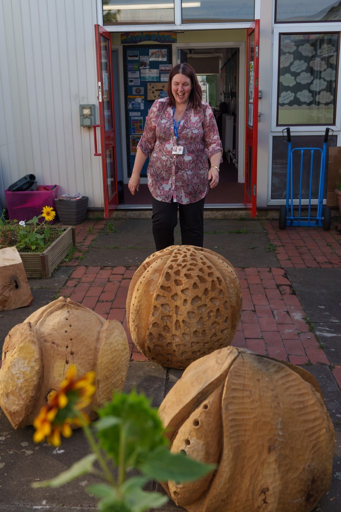 The ‘oak pollen’ sculptures have been delivered and installed in the courtyard of the Junior School. The delight on the face of the headteacher is evidence of the joy that artworks can bring.
