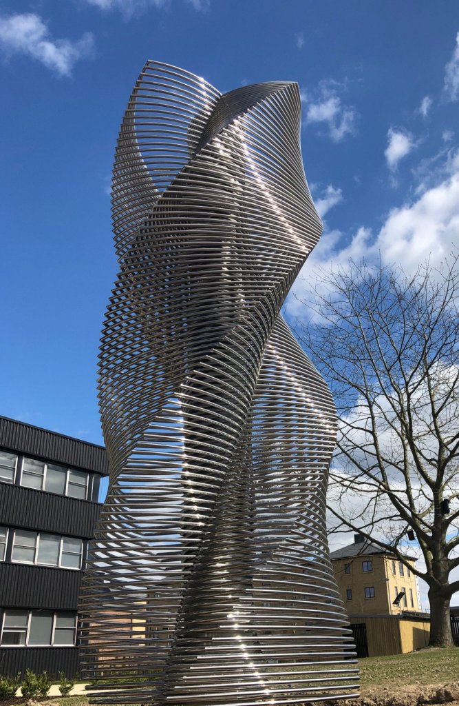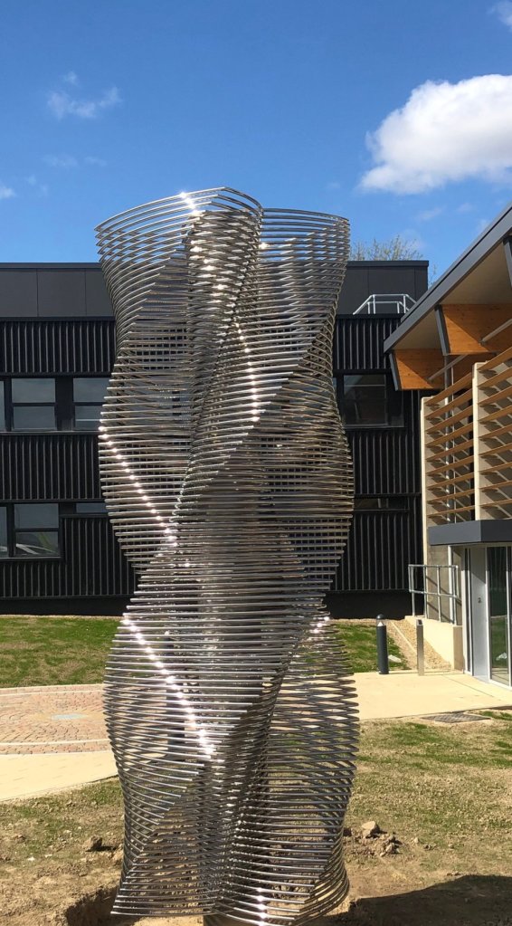 The sculpture created by Will Nash used an abstracted form of a grain of wheat as the basis for the piece. The pair of loops created are repeated 100 times to reflect the centenary and rotated to give the twist that occurs as plants grow. The moire effect of the repeating lines contrasts with the vertical and horizontal lines of the buildings.